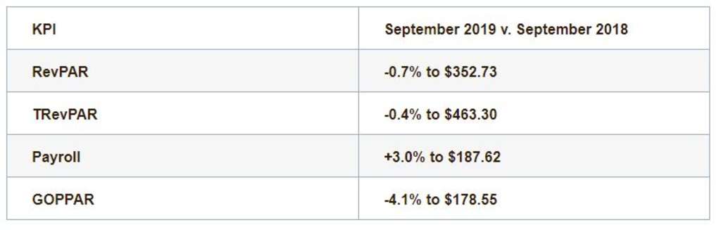 And while revenue gains were strong in September, GOPPAR could have ultimately been stronger if not for an overall jump in expenses. Labor costs on a per-available-room basis were up 4.5% in the month over the same period last year, while total overheads increased 4.1% on a PAR basis.