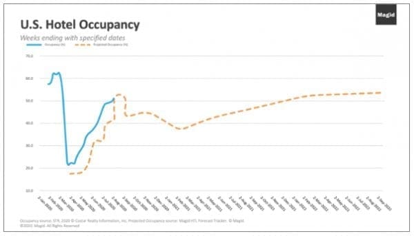 “The forecast shows the continuing significant impact COVID is having on hotel occupancy,” says Rick Garlick, Vice President, Strategy Consultant, Magid. “Currently, the forecast suggests a 39% decline in occupancy for the next month. If the average occupancy at this time of the year (summer) is 70%, this would put current occupancy around 43%.”