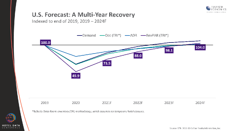 Just released at the 13th Annual Hotel Data Conference, STR and Tourism Economics have upgraded the U.S. hotel forecast for 2021 as a whole and lessened growth projections for 2022. Additionally, full recovery of demand remains on the same timeline for 2023, while revenue per available room (RevPAR) is projected to surpass 2019 levels in 2024.