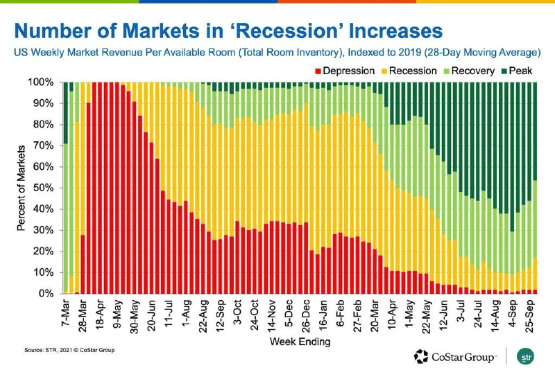 The percentage of markets at “peak,” with total-room-inventory RevPAR more than 100% of 2019 levels, also declined to 46% from 56% a week prior. Thirty-seven percent of markets were in “recovery” and 15% were in “recession,” with total-room-inventory RevPAR between 50% and 80% of 2019 levels. The percentage of markets in “recession” was the highest of the past 14 weeks. Three markets remained in “depression,” with total-room-inventory RevPAR below 50% of 2019 levels. San Francisco remains at the bottom of the index, with RevPAR only 34% of its 2019 level.
