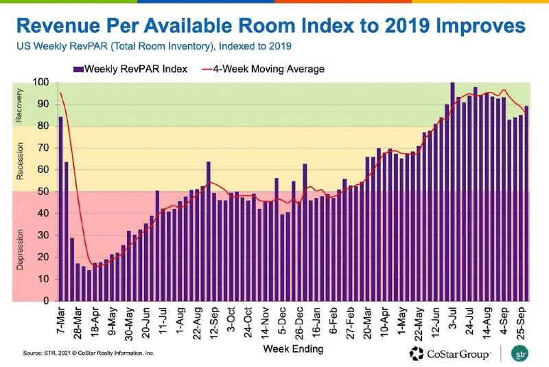 Weekly total-room-inventory revenue per available room indexed to 2019 increased in the week even as RevPAR declined 4.9% on an absolute basis. Again, that’s because of the easy comparisons due to Rosh Hashanah falling during the corresponding week in 2019. Taking the 2019 observance into account, we estimate the RevPAR index would have remained in STR’s “recovery” category, with total-room-inventory RevPAR between 80% and 100% of 2019 levels, as it has been for 16 weeks.