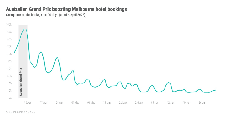 This weekend’s Australian Grand Prix is lifting Melbourne’s hotel occupancy on the books to its highest level since November 2019, according to STR’s Forward STAR.