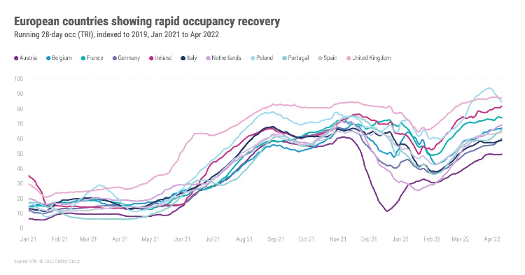 The U.K., Poland, and Ireland are the three European countries to achieve occupancy indexes that are 80% or better to pre-pandemic levels, according to the latest preliminary data from STR that will be presented at the International Hospitality Investment Forum (IHIF).