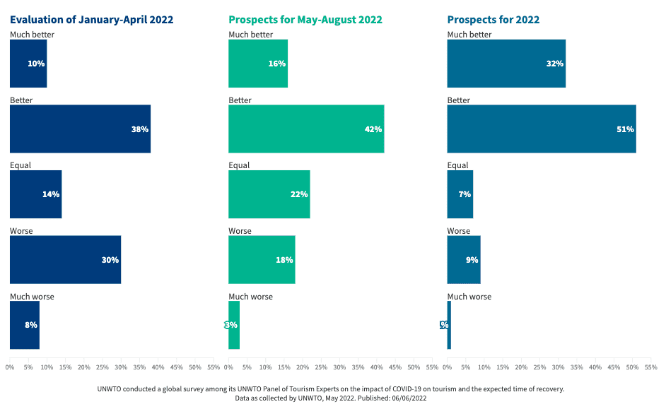 According to the latest UNWTO Panel of Experts survey, an overwhelming majority of tourism professionals (83%) see better prospects for 2022 compared to 2021, as long as the virus is contained and destinations continue to ease or lift travel restrictions. However, the ongoing closure of some major outbound markets, mostly in Asia and the Pacific, as well as the uncertainty derived from the Russia-Ukraine conflict, could delay the effective recovery of international tourism.