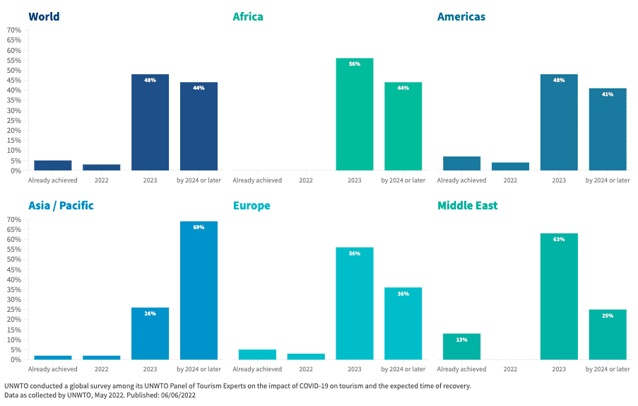 A higher number of experts (48%) now see a potential return of international arrivals to 2019 levels in 2023 (from 32% in the January survey), while the percentage indicating this could happen in 2024 or later (44%) has diminished compared to the January survey (64%). Meanwhile by end April, international air capacity across the Americas, Africa, Europe, North Atlantic and the Middle East has reached or is close to 80% of pre-crisis levels and demand is following.