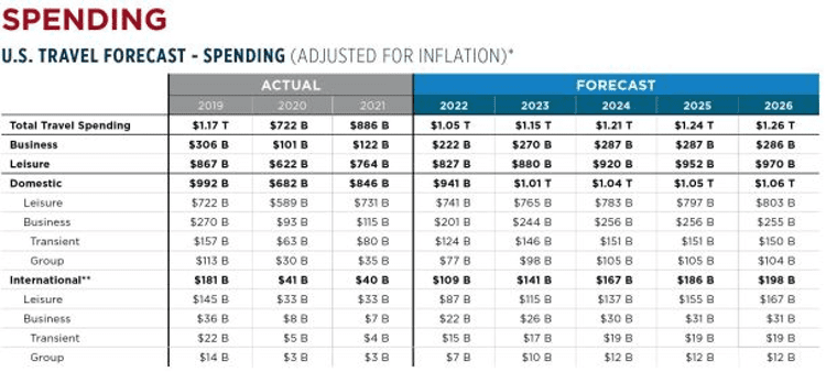 U.S. Travel estimates that $1.05 trillion (in 2019 dollars, adjusted for inflation) will be spent on travel in the United States in 2022, but this is still 10% below 2019 levels and 16% below where it should have been in 2022 if not for the pandemic. The table below reflects annual spending estimates, adjusted for inflation, through 2026.