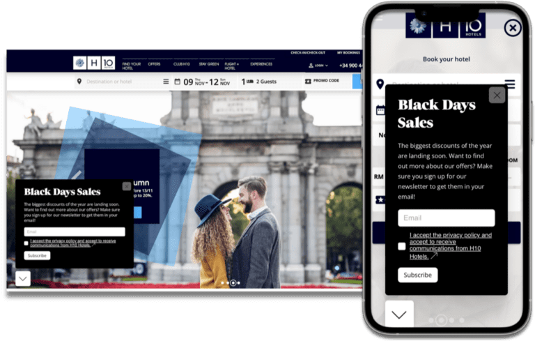 As mentioned, no one wants to miss out on a discount! Another successful approach is to collect the user’s email ahead of your Black Friday campaign. Displaying a Layer on your website promising exclusive discounts to your newsletter subscribers is a smart tactic to collect the email addresses of potential customers, expand your marketing database, and increase the likelihood of future bookings.