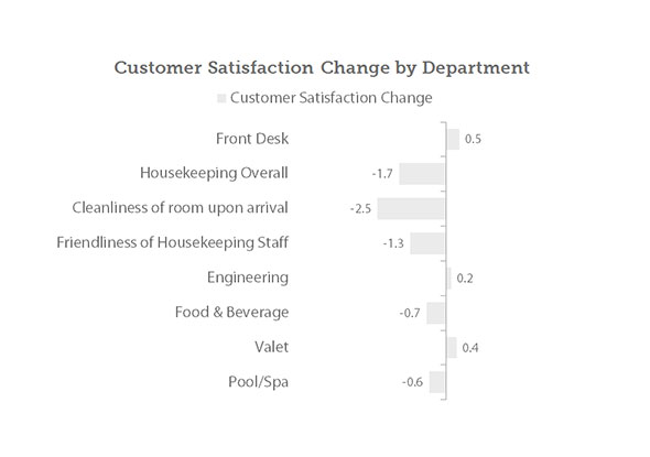 Although this property has increased their occupancy, guest scores are down, especially for housekeeping. It appears that housekeeping is not keeping up with the added occupancy. Guests are reporting unclean rooms upon arrival, and the added work seems to be affecting staff morale.