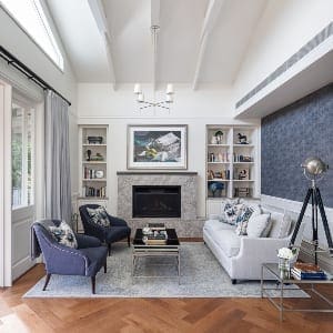 Montville House celebrates natural textures and materials, timber and cool white stone in bright, airy spaces with generous natural light. French doors open onto lush gardens, the interior is adorned with sophisticated floral prints, and restrained earthy and neutral colours reflecting the leafy surrounds.
