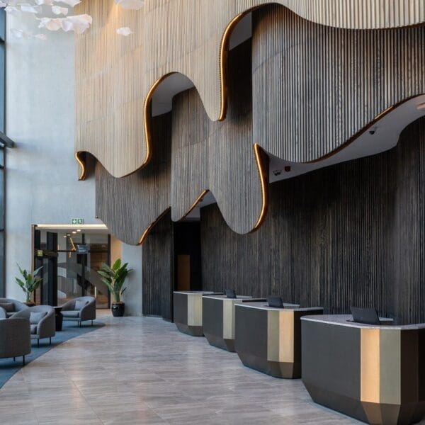 Designed in collaboration by Bunkhouse and ROHE Creative, a female-owned and operated Philadelphia-based interior design firm, with architecture by Memphis-based LLW Architects, Hotel Genevieve is inspired by a city that is much more layered than bourbon and horses, with design that represents the nuances that make Louisville a destination for all. Bunkhouse’s first urban core hotel, the design is inspired by the patron saint of Paris in celebration of the French origins of the city, and all things Louisville—think French modernism meets Old World charm Overall, the spaces are feminine and playful to juxtapose the masculinity often associated with bourbon and downtown, which can be seen throughout the rooms, offering a truly immersive experience with colors that reflect a modern take on a historical color palate of cool and natural combinations—such as shades of blue, terracotta and warm yellow—enveloping every surface including the ceiling to energize the space and bring the outdoors in. Custom, curvaceous consoles from ROHE in an ivory high-gloss lacquer reflect the saturated hues and add another layer of luminescence to the room. Kentucky’s quilt culture also became a muse, including modern quilting patterns in the corridor carpet and bedroom throws. This myriad of inspiration culminates in a design that is effortless, vibrant, and, in the best ways, a bit over the top.