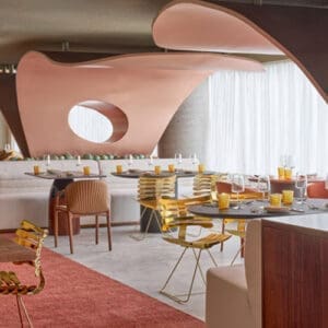 W São Paulo is a striking fusion of contemporary design and local authenticity. Built on the site of the iconic Teatro Via Funchal, the hotel’s design is a collaboration between Aflalo/Gasperini Arquitetos, with landscaping from Benedito Abbud, and interiors by Nini de Andrade Silva. W São Paulo celebrates Brazilian modernist architecture with angular lines, sinuous curves, and a vivid color palette with various shades of greens, blues, metallics, and golden tones. With unique design pieces, rich textures, and organic materials like Brazilian stone and wood, the hotel creates a playful yet sophisticated environment that captures the city’s cultural essence, offering guests a seamless fusion of modern luxury and local heritage.