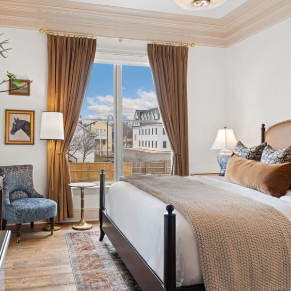 Brought to life by owners Kevin and Remington Ash of Madison Dale, in collaboration with local design firm wldwst and renowned architect Michael Graves, the property masterfully melds Federal, Colonial, and Italianate architectural styles across three distinct buildings, including a preserved 1885 historic house. The interiors evoke a sophisticated blend of Ralph Lauren-inspired elegance and bespoke craftsmanship, with original regional art, antique furnishings, and rare finishes defining every detail. The grand lobby, anchored by a floor-to-ceiling sepia-toned mural of Virginia’s pastoral landscape and antique brass chandeliers, captures a timeless refinement that flows seamlessly throughout the entire property.