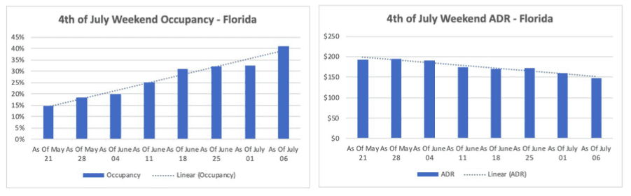 This data further illustrates the recent phenomenon in our industry of shorter-than-normal booking windows. The data below shows that in the final few days leading up to the weekend, hotel occupancy in the state of Florida jumped by nearly 10%. Additionally, while occupancy steadily climbed each week, rates slowly decreased.