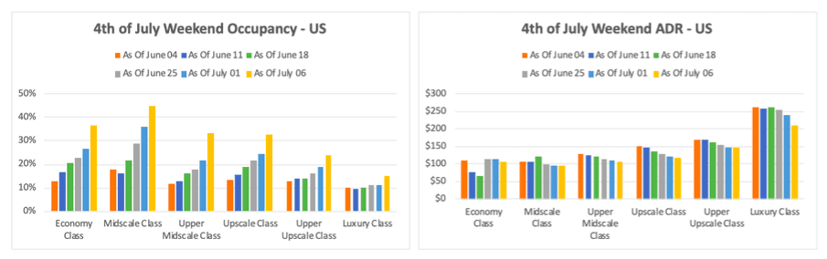 Leveraging data from the MAPP report, in the following charts, myDigitalOffice reported occupancy and ADR for the July 4th holiday weekend, as of each week dating back to 5/21. Then, as of Monday July 6, the report shows what actually happened.