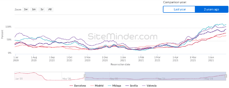 The volume of hotel bookings in Spain has returned to the same levels of two years ago, according to data collected from the SiteMinder World Hotel Index on June 28, 2021.