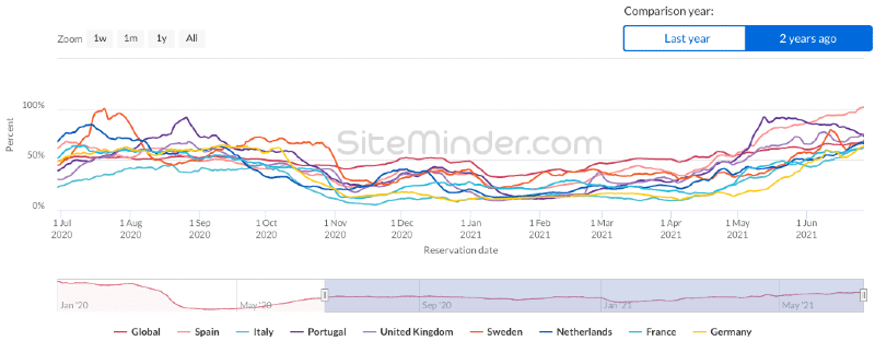 Though there are promising signs, not all countries in the region are recovering at the same rate as Spain. In addition to Portugal, among the next in line are Ireland and the UK, which are currently at hotel booking volumes of 91% and 74% of those of the same time period in 2019.